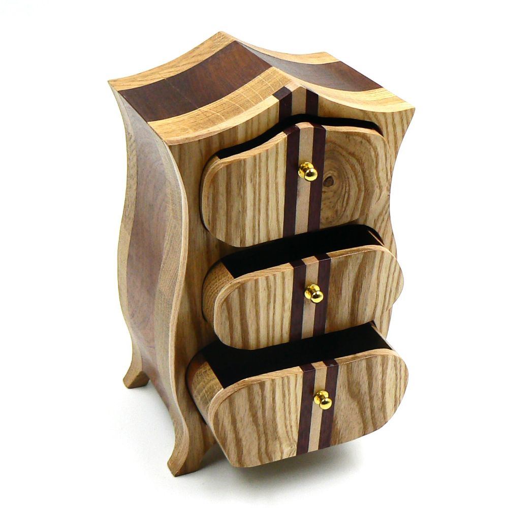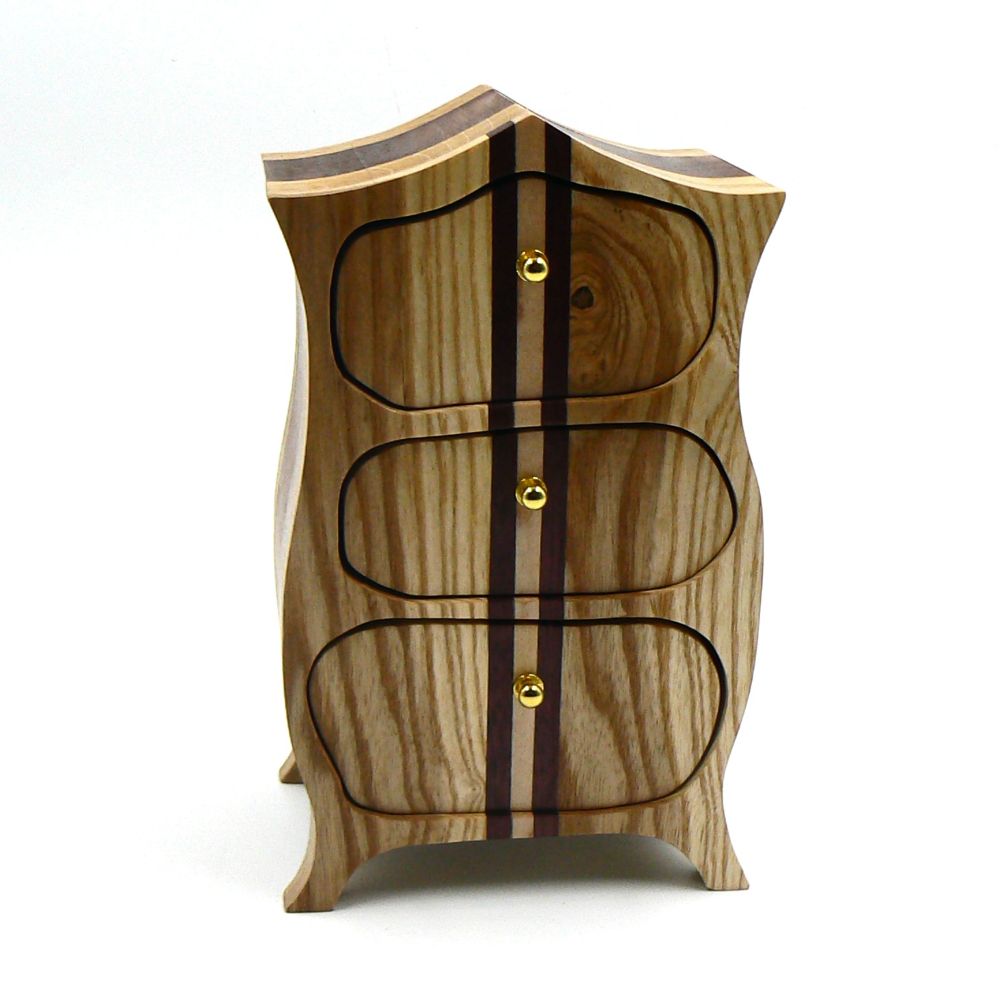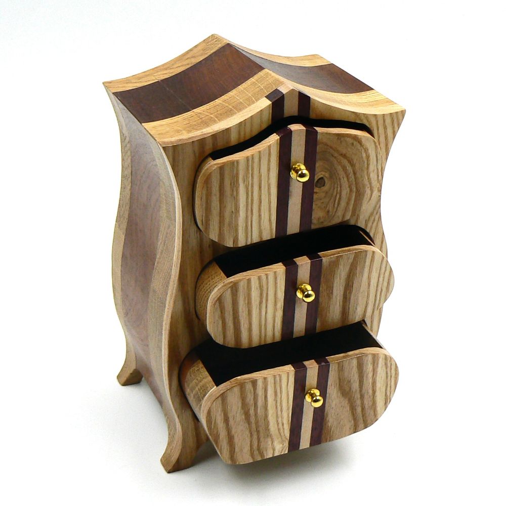 Heirloom box or jewellery box in Sapele, Oak, Maple, Purple Heart and Ash. Two removable trinket drawers with brass handles.